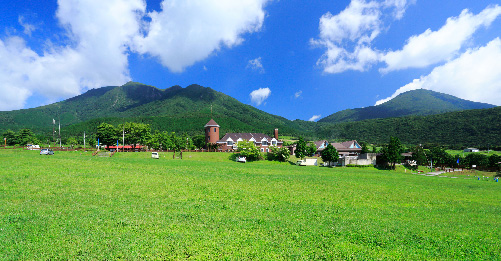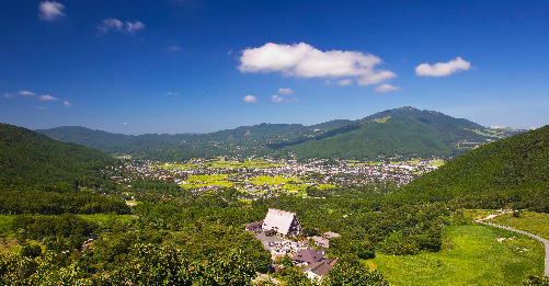 녹음이 짙게 물드는 유후다케 산이 푸른 하늘에 비치는 계절